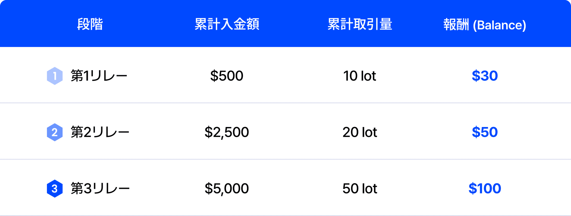 新規顧客:「参加する」ボタンをクリック後、初回入金100ドル+初回取引量0.1ロットを完了